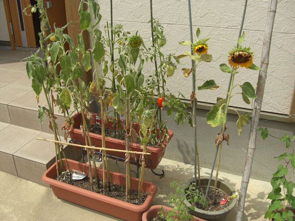 3年前から毎年上の前でひまわりとトマトを育ててるんですが、今年はひまわりは大きな鉢を使って花を大きくできないかと思いチャレンジ、トマトは3種類の品種を植えてます。