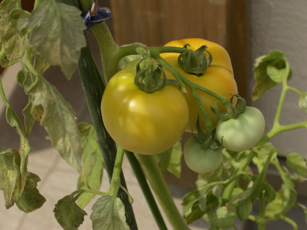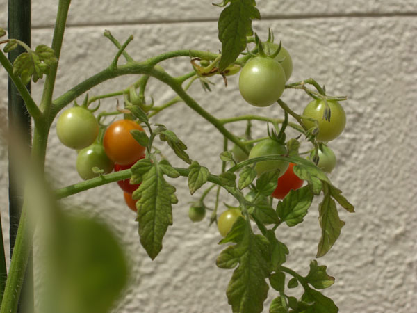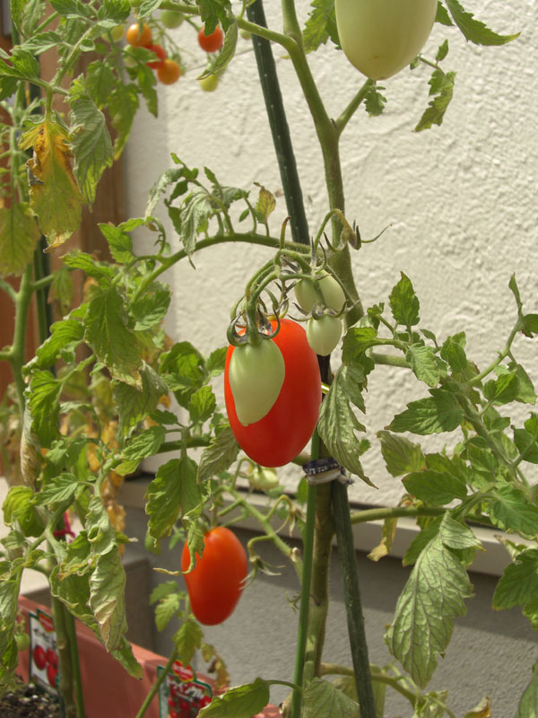 プチトマトは育ちも速く、実をつけてから赤くなるまで速かったんですが、今年は梅雨までが寒く、育ちが悪かったので、ようやく最近暑くなってからイタリアントマトのほうも赤くなり出しました。中玉のほうは実すら付けてくれなかったんですがようやく実がなり、これからって感じです。