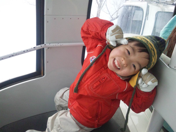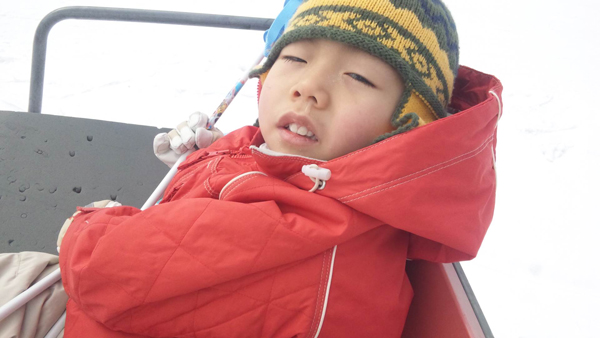 初めてスキーを履いても動じる様子はなかったのでまずはスピードに慣れて楽しいと思ってもらうことが一番だと思いいきなりリフトに乗せてファミリーゲレンデを4回ほど抱っこして滑り降りました。はじめはスピードに怖がってたが、さすが男の子、スピードに楽しみ出してきようです。