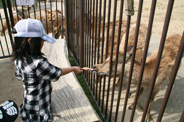 子供たちも初めは足取り軽くがんばってましたがやはり迷ってうろうろしてる間に疲れてきたらしく、進むのに時間がかかりはじめました。迷ってるうちに、動物園に迷い込んだようで(この公園の中には無料の動物園もあったのです!)鹿がわらわらといる檻にたどり着きました。休憩がてらちょっと覗いてみると鹿せんべいが売っててえさをあげることができる!早速150円でせんべいを自販機で買ってあげることに。