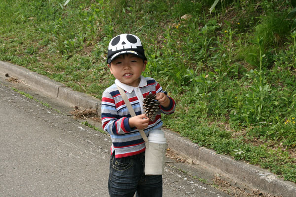 (歩いてる途中で自分の顔ほどある松ぼっくりを見つけてうれしそうな下の子。)