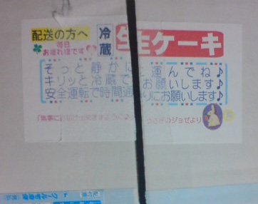 「配達の方へ毎日ご苦労様です。そっと静かに運んでね♪きりっと冷蔵でお願いします♪安全運転で時間通りにお願いします♪」