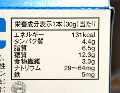 131kcal。ほう、なかなかやりますな。131kcalといったらんー、肉まん半分ぐらいですね。逆に言うとこれ2本食べても肉まん1個のカロリーと変わらないわけで、それってなかなか魅力的です。もっと言うと俺の基礎代謝が1850ぐらいだから1食4本で3食食べてもOKだねww(そんな生活しないけどw)