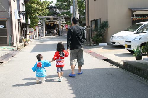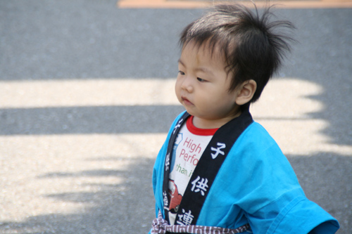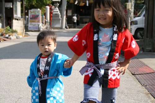 今年は大祭りということで、子供たちにハッピを着せました。二人ともはしゃいでます。