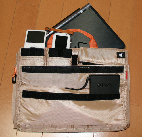 携帯も、iPodもまとめてこのかばんで持ち運べば、かばんの中で周辺機器類が散乱することもないし、USBメモリーとかハブとか小物ってすぐにどこに行ったか分からなくなるんだよね。こうやってひとつのかばんに入れるようにしておけばなくすことも少ないし。