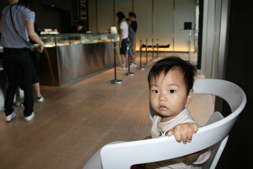 店内はこんな感じ。子供が座ってるいすの後ろが全部窓ガラスになってて窓の向こうは海です。