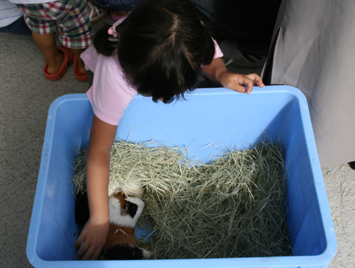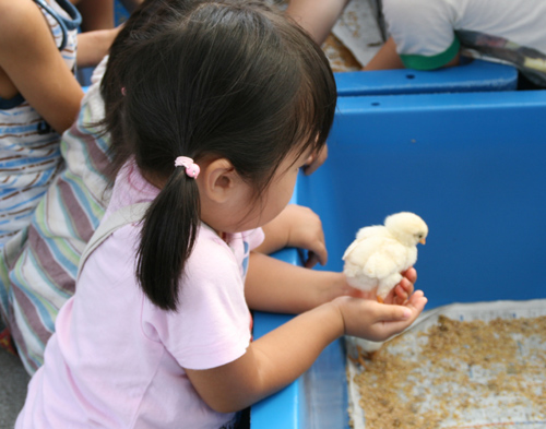 さて、ペンギンコーナーを越えるとふれあいコーナーなるものを発見。ビビリ屋の娘に体験させてみました。はじめは周りの子に圧倒されたり、大き目のハムスターやひよこを怖がっていましたが、俺が手渡すとようやく慣れて「かわいい~」ってその場から動かなくなりました。